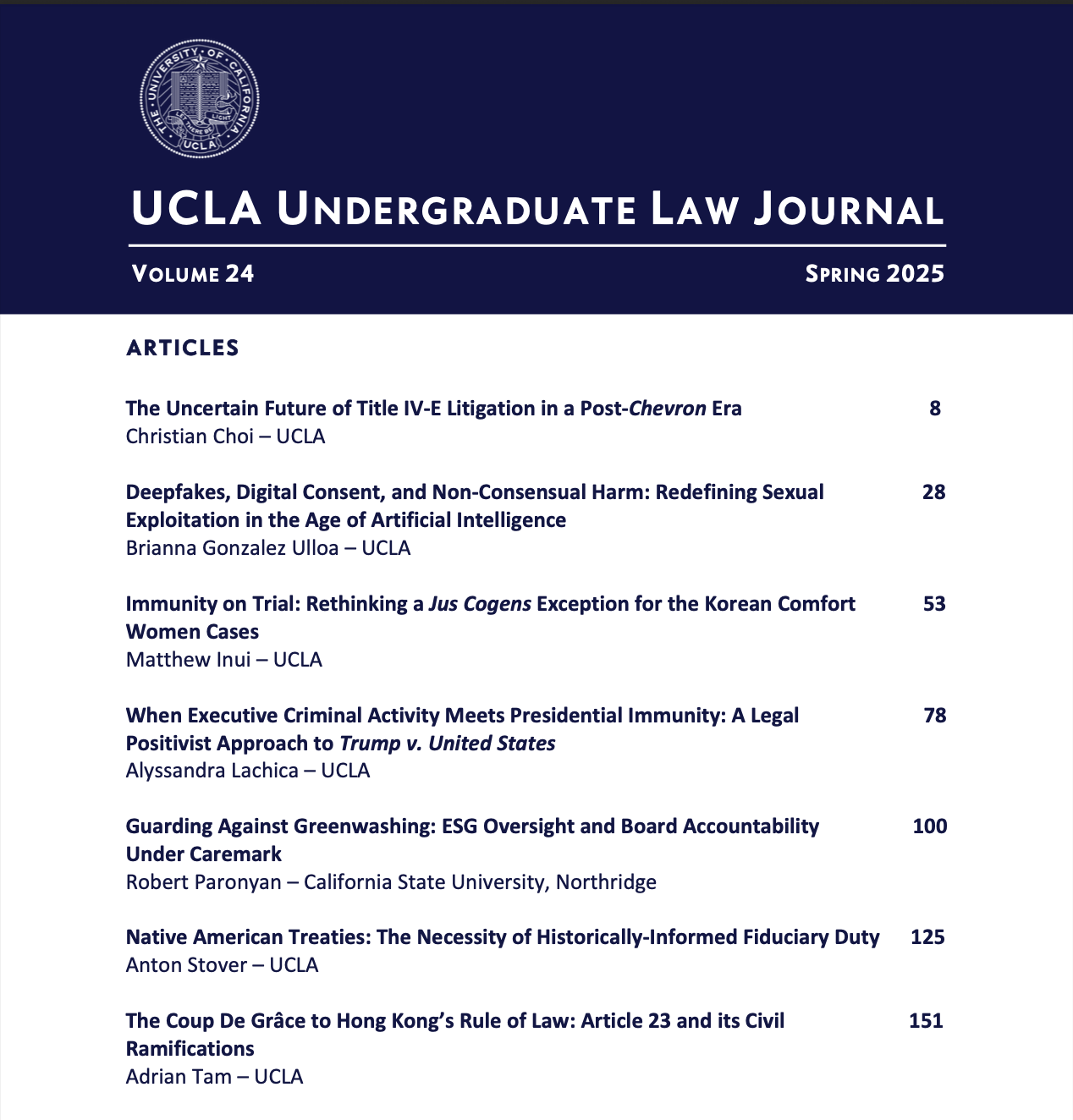 Since its inception in 2002, the UCLA Undergraduate Law Journal has published 24 volumes of high-quality legal scholarship exclusively produced by undergraduate students from universities across the world. We are a generalist journal, publishing an annual volume of wholly student-produced scholarship pertaining to a wide variety of legal issues, including contemporary issues in U.S. domestic law and the international sphere, legal theory, and practical aspects of the law. Based at the #1 public university in the United States, the Journal has established itself as one of the pre-eminent publications for undergraduate students seeking to explore in-depth research on the most pressing contemporary issues of society, politics, and economics from a legal perspective. We are modeled on the country’s leading law reviews, which regularly publish cutting-edge research by the world’s top legal scholars. The Journal immerses contributors in an authentic experience that mirrors that of bona fide legal research that drives contemporary political thought and social discourse